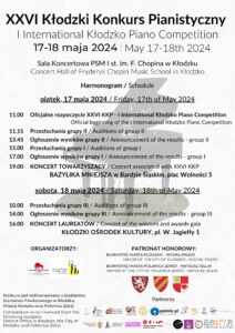 - XXVI Kłodzki Konkurs PianistycznyZapraszamy do udziału w XXVI Kłodzkim Konkursie Pianistycznym! Po sukcesie zeszłorocznej edycji konkursu, który odbył… Dowiedz się więcej: XXVI Kłodzki Konkurs Pianistyczny