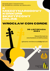 - Wrocław Con Corde 2024Zapraszamy do udziału w II Międzynarodowym Konkursie Skrzypcowym Online “Wrocław Con Corde”. Konkurs adresowany jest… Dowiedz się więcej: Wrocław Con Corde 2024